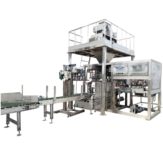 設(shè)備組成主要包括:包裝袋輸送機、上袋機、抽氣裝置、自動折邊、縫包機、輸送機等。
